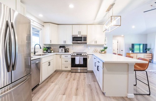 Welcome to your perfect home away from home! This 3-bedroom, 2-bath home is your perfect place for a cozy getaway offering modern amenities, comfort, and a warm ambiance that will make your stay truly special. The charming Sky Blue Lounge creates the ideal space for ultimate relaxation, while the open-concept kitchen and spacious layout provide everything you need for a convenient and enjoyable stay.